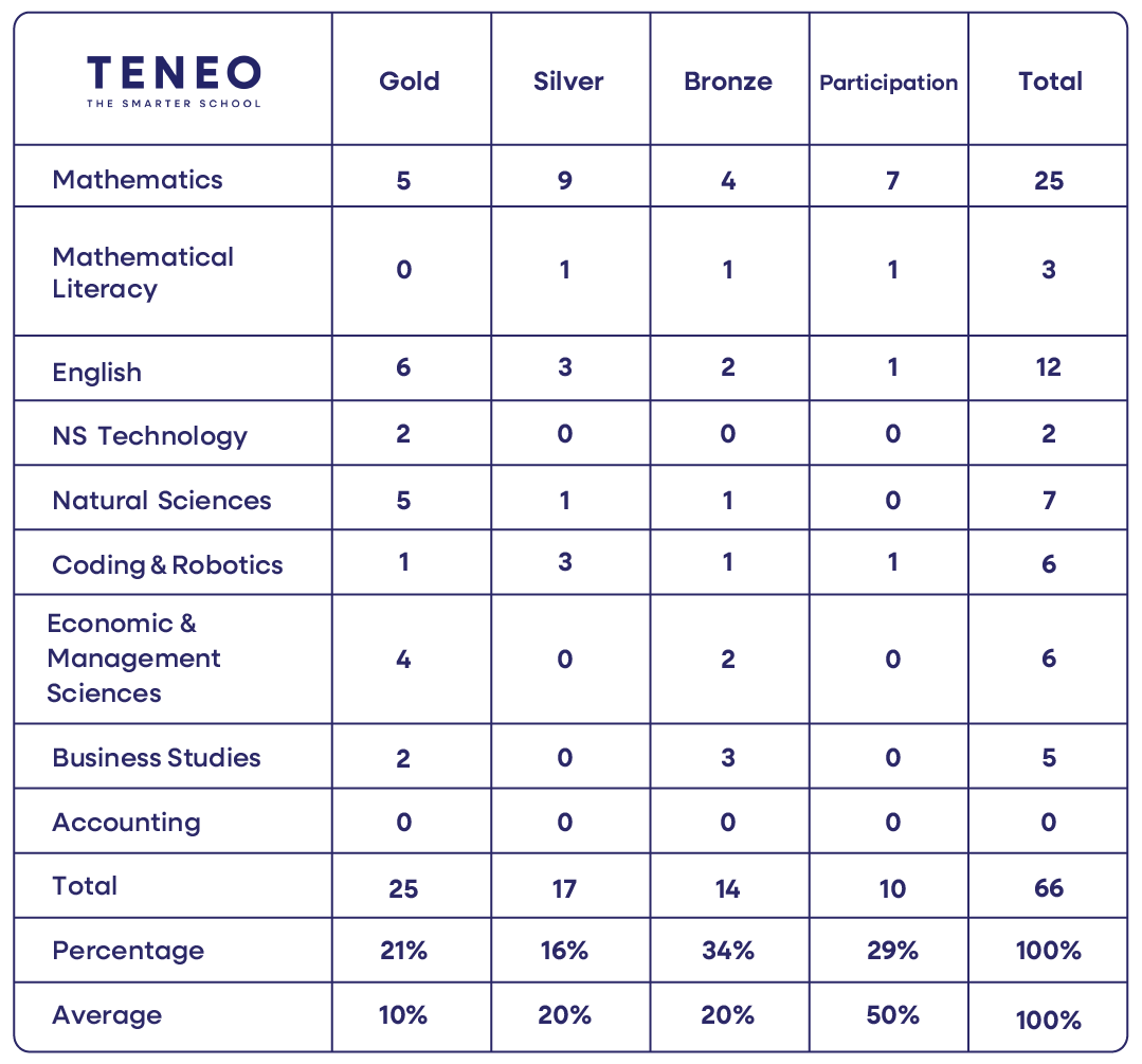 Teneo School achieved an impressive 85% medal rate across all participants, with five subjects achieving a perfect 100% medal rate – a remarkable showcase of academic excellence and consistency.